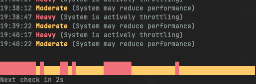 To kick off this first edition of dev notes, here's toast, a CLI app I put together to monitor thermal pressure/throttling on my Mac. I'm equator-side right now and my laptop is definitely on the struggle bus due to the heat, and reading this article about building MacThrottle, a menu bar app that tracks thermal pressure, inspired me to build a simple CLI app to show when my Mac was throttling.